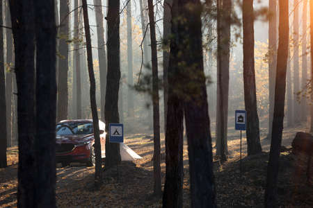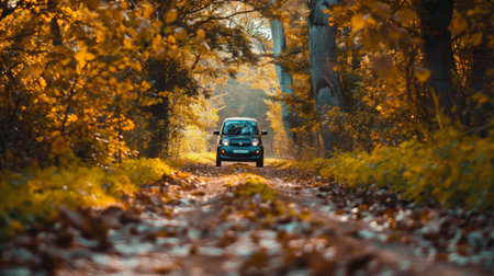 Car in autumn forest. Car in autumn forest. Car in autumn forest.
