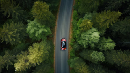 Digital artwork of aerial view of a red road car in forest, high quality, high resolution
