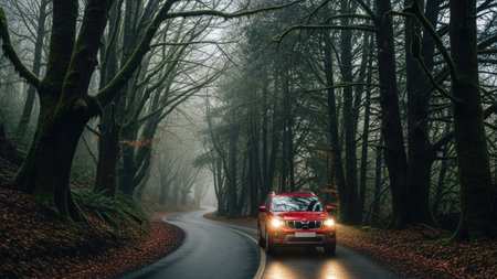 A red SUV travels along a curved road through a dense, foggy forest. The scene features tall, bare trees and a winding asphalt path. Soft lighting creates a moody atmosphere. This image could be suitable for travel, automotive, or environmental content.