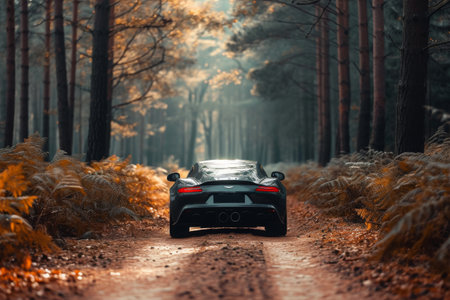 A black sports car speeds along a winding forest road surrounded by lush green trees, An adventurous sports car going through a forest road, AI Generated