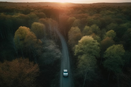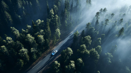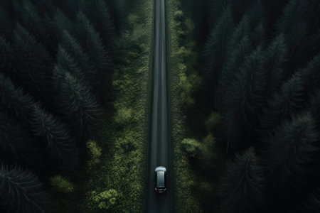 Aerial view green forest with car on the asphalt road. Created with Generative AI technology