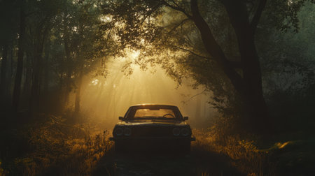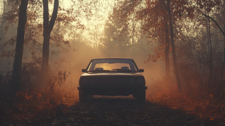 Car front portrait with a darkened cabin, parked in a misty natural setting at sunset, golden rays and fog creating a serene, moody scene