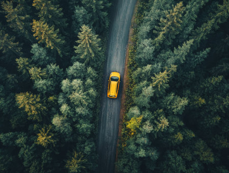 A drone captures a car driving along a highway nestled within a forest, showing the tranquility of a scenic drive through nature.