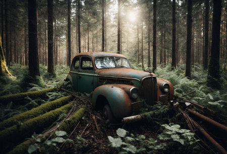 A deserted car in a misty forest is bathed in an ethereal glow. Concept Abandoned Car, Misty Forest, Ethereal Glow, Mysterious Atmosphere