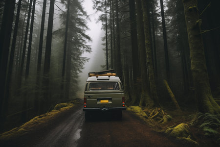 Travel van riding through misty rainforest. Camper car in forest. Road trip adventure. Generative AI