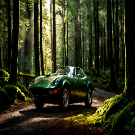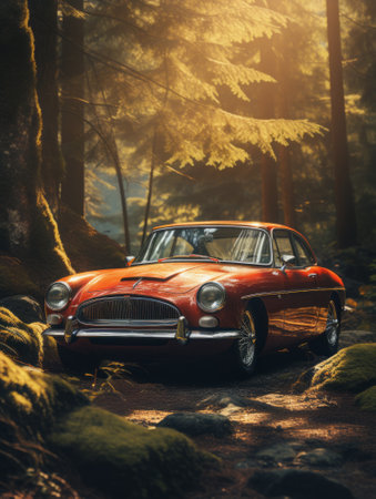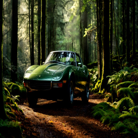 vintage car parked on a forest trail. The car appears to be a classic model, possibly a muscle car, and is the main subject of the image.