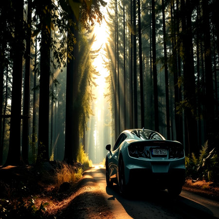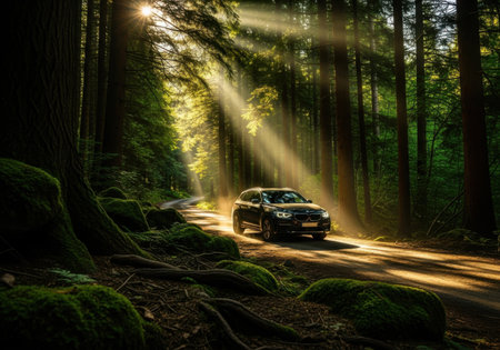 Sunlight streams through the trees along a forest road as a vehicle waits nearby on a misty morning