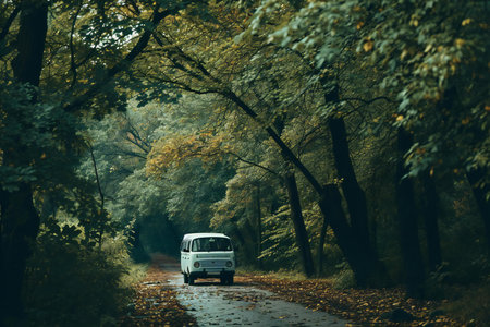 camper van in a beautiful forest landscape. Van life. adventure holiday. Generative ai