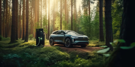 Electric vehicle and EV electric energy for the environment, EV cars on forest roads at ecological ecosystem healthy environment Electric cars and nature. Generative Ai.