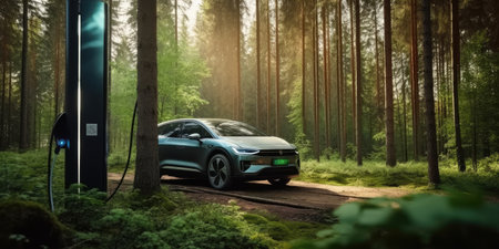 Electric car EV charging battery at charger station in green forest. distinct generative AI image.