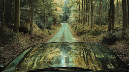 A captivating view from inside a car showing a serene road through lush forest. The image captures an inviting path surrounded by vibrant trees and gentle sunlight.