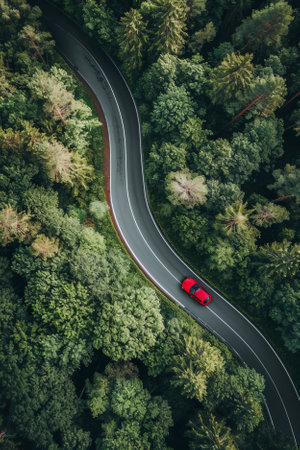 A red car driving on the winding road in a green forest, aerial view, high-angle shot, high-resolution photography, insanely detailed, fine details, isolated plain background, stock photo color grading, cinematic lighting, cinematic. --ar 53:30 --v 6.1 Job ID: 1d3fcf5f-550a-4f3c-84b9-847ff4e83f1a