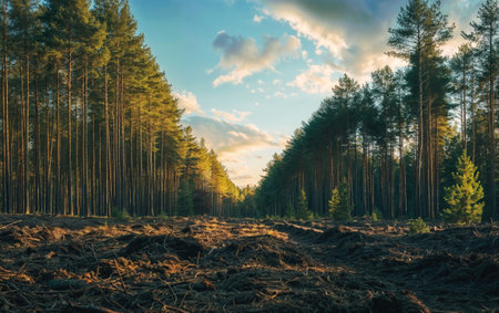 industrial deforestation landscape with sun effect