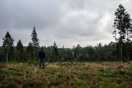 Pensive young man standing in czech forest with dark mood dramatic sky
