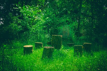 Several tree stumps in the garden. Handmade furniture on green grass background.