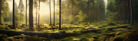 the serenity of panoramic forest scenes, where lush woodlands unfold in layers of greenery. the intricate play of light filtering through the foliage, creating a harmonious of shadows and sunbeams.