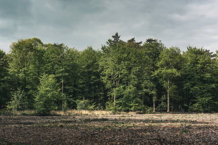 Forest with bare field under cloudy sky in spring.
