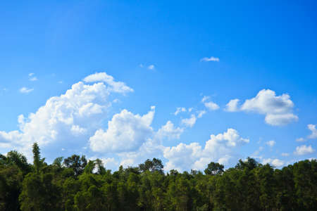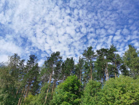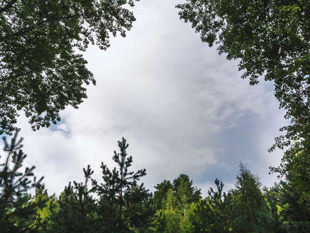 Deciduous trees and ship pines against a beautiful sky with clouds on a hot summer day