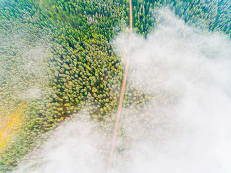 Aerial view of misty forest in the morning. Beautiful nature landscape