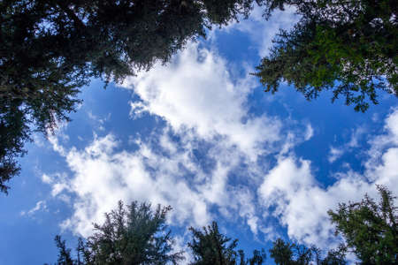 Summer sky with clouds in a frame of green foliage of trees. Natural background with copy space