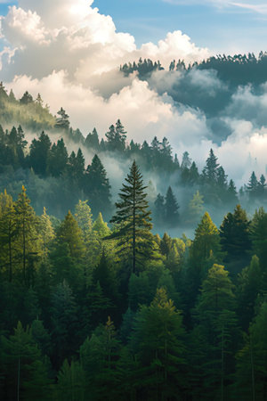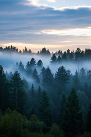 A serene view of a dense forest adorned with towering pine trees, shrouded in mystical fog, creating a tranquil atmosphere in a beautiful wilderness setting.