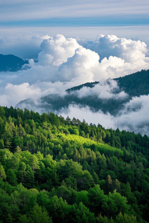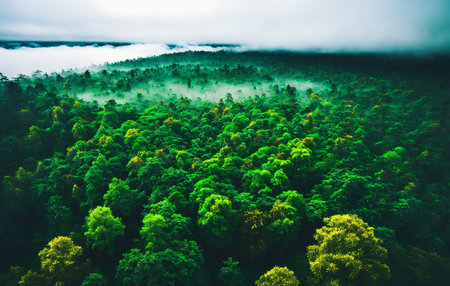 A stunning aerial view of a lush green forest canopy surrounded by mist, showcasing the beauty and tranquility of nature. Perfect for eco-friendly themes.