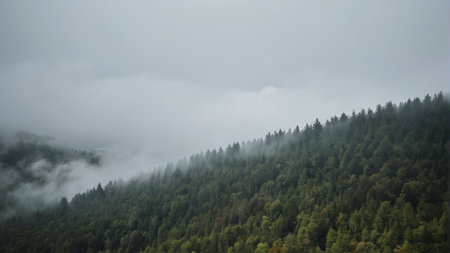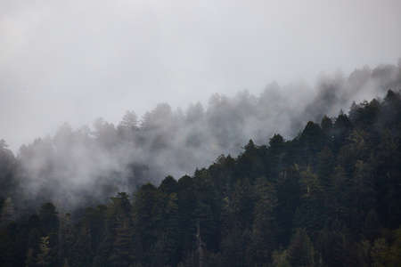 Forested mountain slope in low lying cloud with the evergreen conifers shrouded in mist in a scenic landscape view