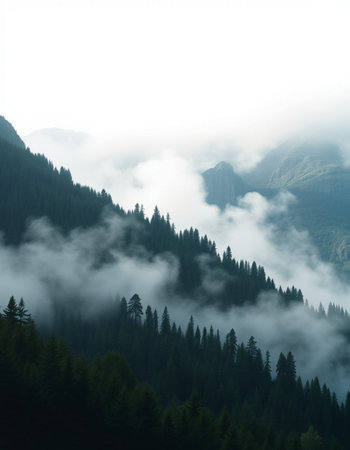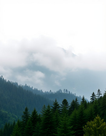 A stunning mountain landscape featuring a dense evergreen forest enveloped in mist, creating a tranquil atmosphere perfect for nature and travel enthusiasts.