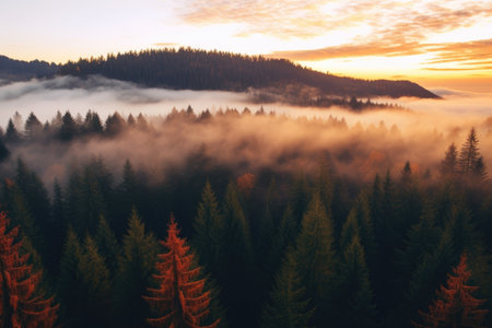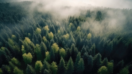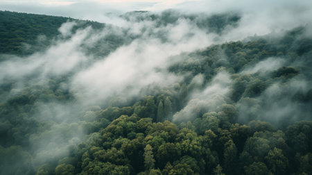 Tranquil aerial view of misty forest canopy captured with drone photography in the morning, showcasing lush greenery and serene treetops in a natural wilderness environment