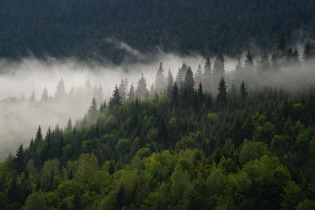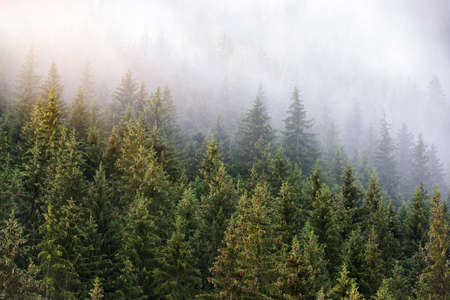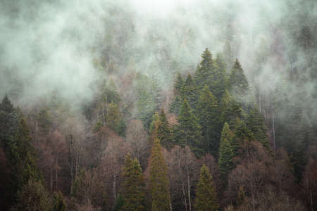 Scenic landscape view of the forested mountain slope in clouds with the evergreen conifers in mist