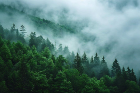 An atmospheric landscape features tall evergreen trees shrouded in thick fog. The scene is dominated by shades of green and gray, with soft lighting and a blurred background. Suitable for a variety of uses including environmental, travel, and natural beauty themes.