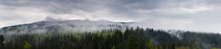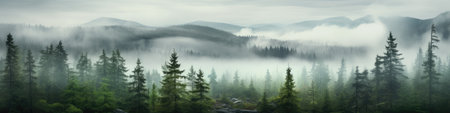 Panoramic view of misty foggy mountain landscape with fir forest, morning fog