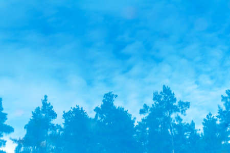 Forest reflection on blue pool water surface. Blurred background. Cloudy summer sky.