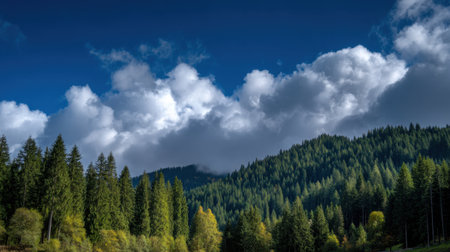 This captivating image showcases a lush green forest of pine trees beneath a dramatic sky filled with fluffy clouds, creating a serene and picturesque mountain view.