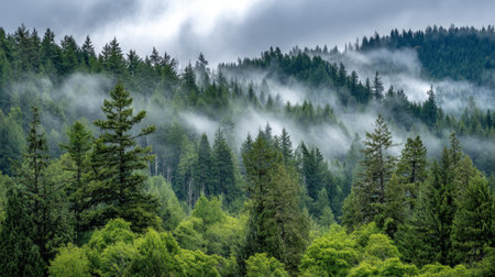 A captivating forest scene showcasing lush green trees enveloped in mist and fog, creating a peaceful and serene atmosphere in nature's untouched beauty.