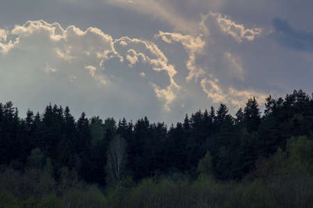 Dramatic stormy sky over pine forest