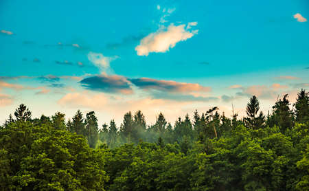 Panorama, sunset over forest with dramatic sky and colorful clouds