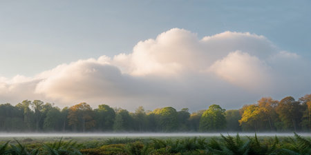 AI Generated. A calm morning with low clouds over a forest