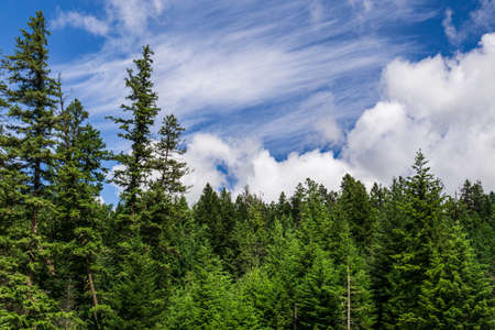 Sky with clouds and the tops of coniferous forest.