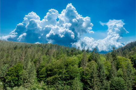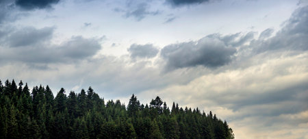 a deep clouds in the sky under the spruce Carpathian forest, Skole Beskids National Nature Park, Lviv region of Ukraine