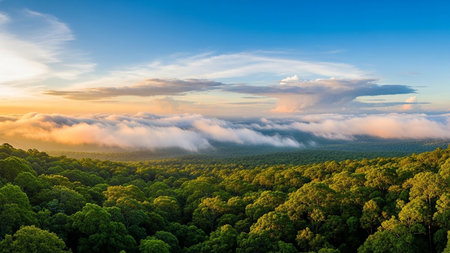 Aerial view of the Amazon rainforest canopy with clouds at sunset. Clear details and vibrant colors enhance vi...