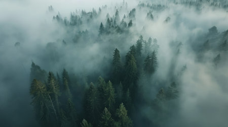 Tranquil aerial view of misty forest canopy captured with drone photography in the morning, showcasing lush greenery and serene treetops in a natural wilderness environment