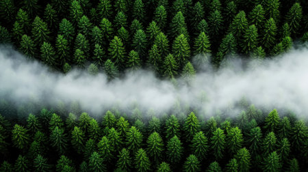 A stunning aerial view of a lush green forest canopy surrounded by mist, showcasing the beauty and tranquility of nature. Perfect for eco-friendly themes.