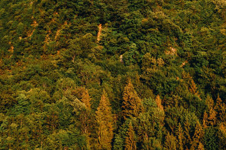 Beautiful colorful green yellow orange and red autumn trees forest on the hill.