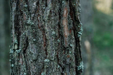 Thick rough wood bark texture background. Close up shot, no people, green blurred forest scene in the background.