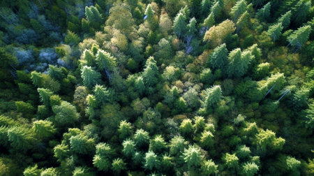 An overhead view reveals a dense forest, dominated by evergreen trees in various shades of green. The composition highlights the texture of the foliage and its layered arrangement. The style suggests a natural environment suitable for environmental concepts or background use, conveying a sense of serenity.