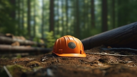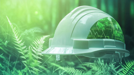 This image depicts a modern safety helmet featuring digital graphics, set against a vibrant forest backdrop, symbolizing innovation and sustainability in the construction industry.