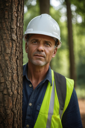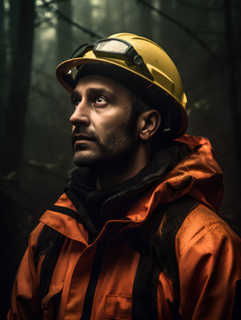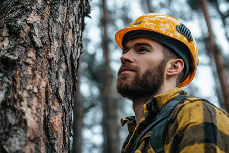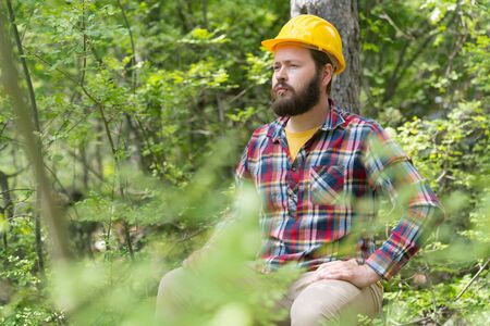 Portrait of mature woodsman posing in forest in open air and looking away with pensive expression, wearing uniform and yellow helmet, log inspecting territory.