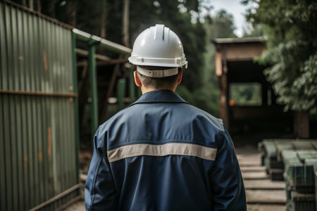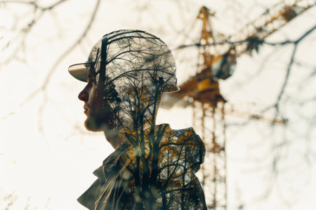 A construction worker stands deep in thought, blending nature with urban development. He is silhouetted against a crane and trees, capturing the duality of his environment as the sun sets.