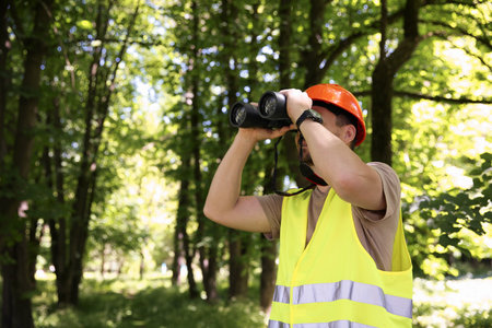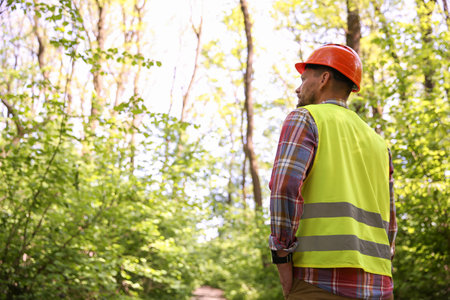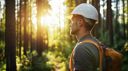 Forest worker observing nature during golden hour near a hiking trail in the woods